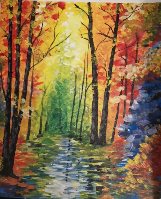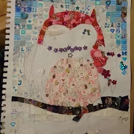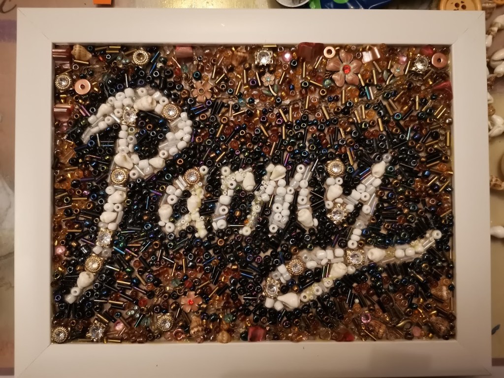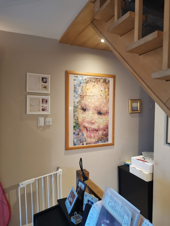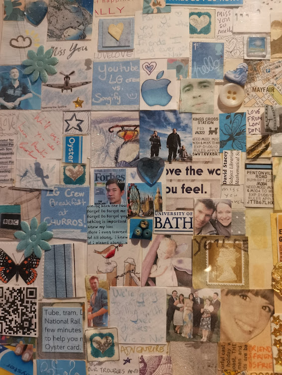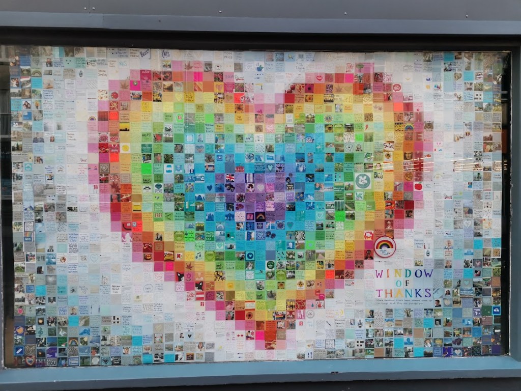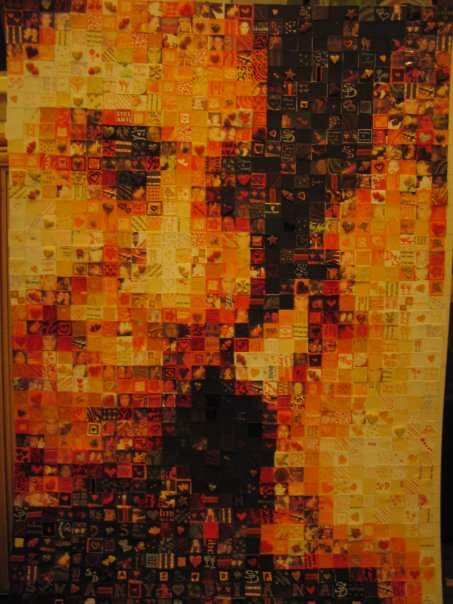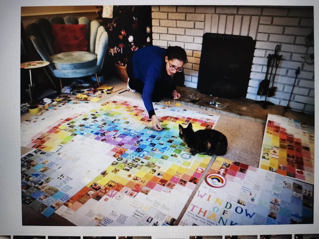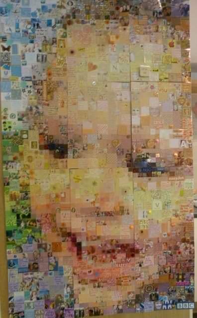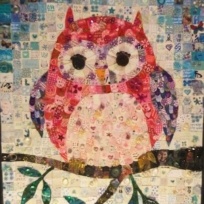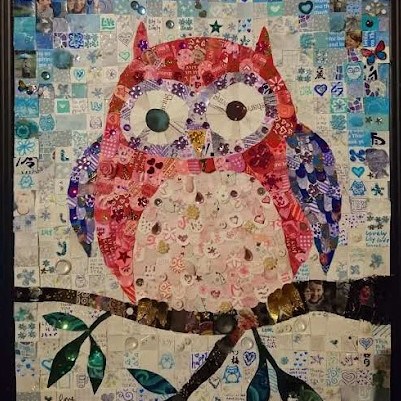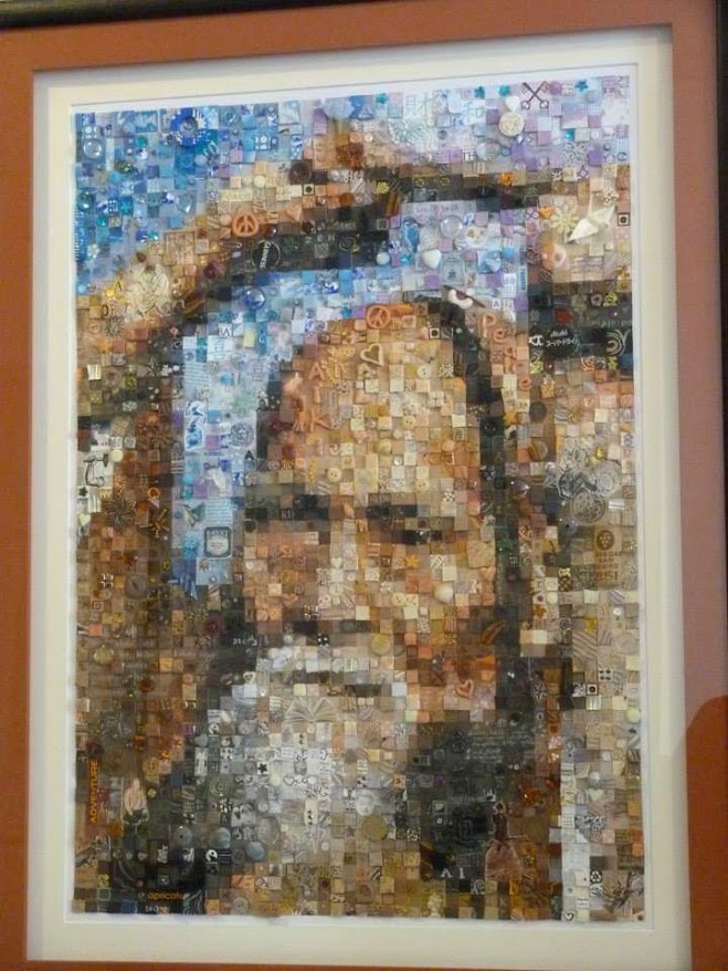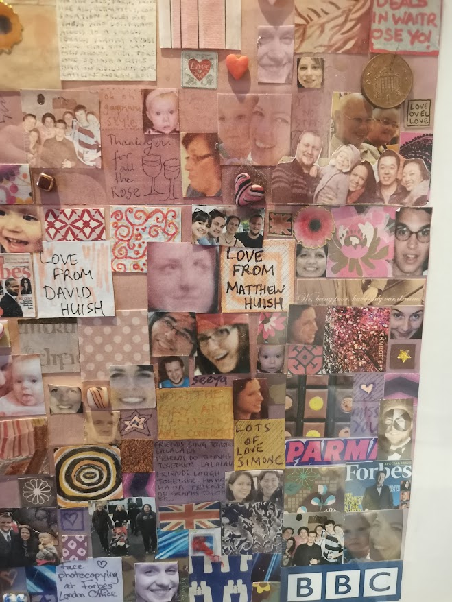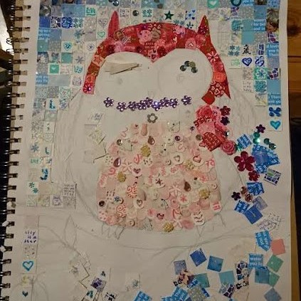 The Window of Thanks, a lockdown community art project I created in Melksham made of 1600 squares and filling a pub window – see the full story here: https://thecomfortzone.blog/2021/02/06/the-window-of-thanks/#more-1073Morihei Ueshiba, the founder of Aikdo, created for my blackbelt Aikido friendWedding present for a pair of colleagues who met through their job in an orange and black themed barLeaving present for my friends who were moving away, made out of messages and images from all their friends, in the image of their daughterBirthday present for ParmyCommission of a forest in the style of Leonid Afrimov